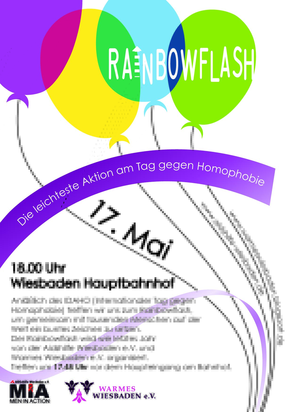Am Freitag, 17. Mai, ist der jährliche Tag gegen Homo- und Transphobie (IDAHO), an dem Organisationen weltweit zu politischen Demonstrationen, Flashmobs und anderen Aktionen aufrufen. In Wiesbaden veranstalten die Vereine Warmes Wiesbaden und AIDS-Hilfe Wiesbaden einen sogenannten Rainbowflash. „Ziel ist es, auf die gesellschaftlichen und staatlichen Diskriminierungen gegenüber Homo-,Bi- und Transsexuellen Menschen aufmerksam zu machen und ein Zeichen der Akzeptanz zu setzen.“ sagt die Vorsitzende von Warmes Wiesbaden, Mascha Holly. Treffpunkt ist am 17. Mai 2013 um 17.45 Uhr am Vorplatz des Hauptbahnhofs. Um 18 Uhr lassen die Teilnehmer dann gemeinsam bunte Luftballons steigen. http://warmeswiesbaden.blogsport.de/ , www.aidshilfe-wiesbaden.de