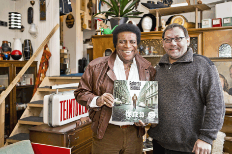Es dauert nicht lange, bis Passanten aufmerksam werden. „Das ist doch …“ Ja, genau, das ist er. Und er genießt es, erkannt zu werden. Er winkt, grüßt, plaudert und posiert bereitwillig für Fotos mit Taxifahrern und Familienvätern, deren Kids nun allerdings so gar nicht wissen, welche Berühmtheit der stolze Papa da gerade beim Kiez-Spaziergang entdeckt hat. Mehr als ganz genau weiß natürlich der Eigenart 7-Besitzer, wer vor ihm steht, als wir unangekündigt mit Roberto Blanco in seinem kleinen vollgestopften Laden stehen. Roberto ist beeindruckt, Luzandra verzückt von dem, was Thomas Wischert hier alles verkauft. Alles verkauft er, nur eben diese eine Schallplatte nicht. Das macht er auch Roberto Blanco klar, der die Scheibe, die zum Auslöser unserer Coverstory wurde, mit Widmung signiert. Und sie damit endgültig unverkäuflich macht.