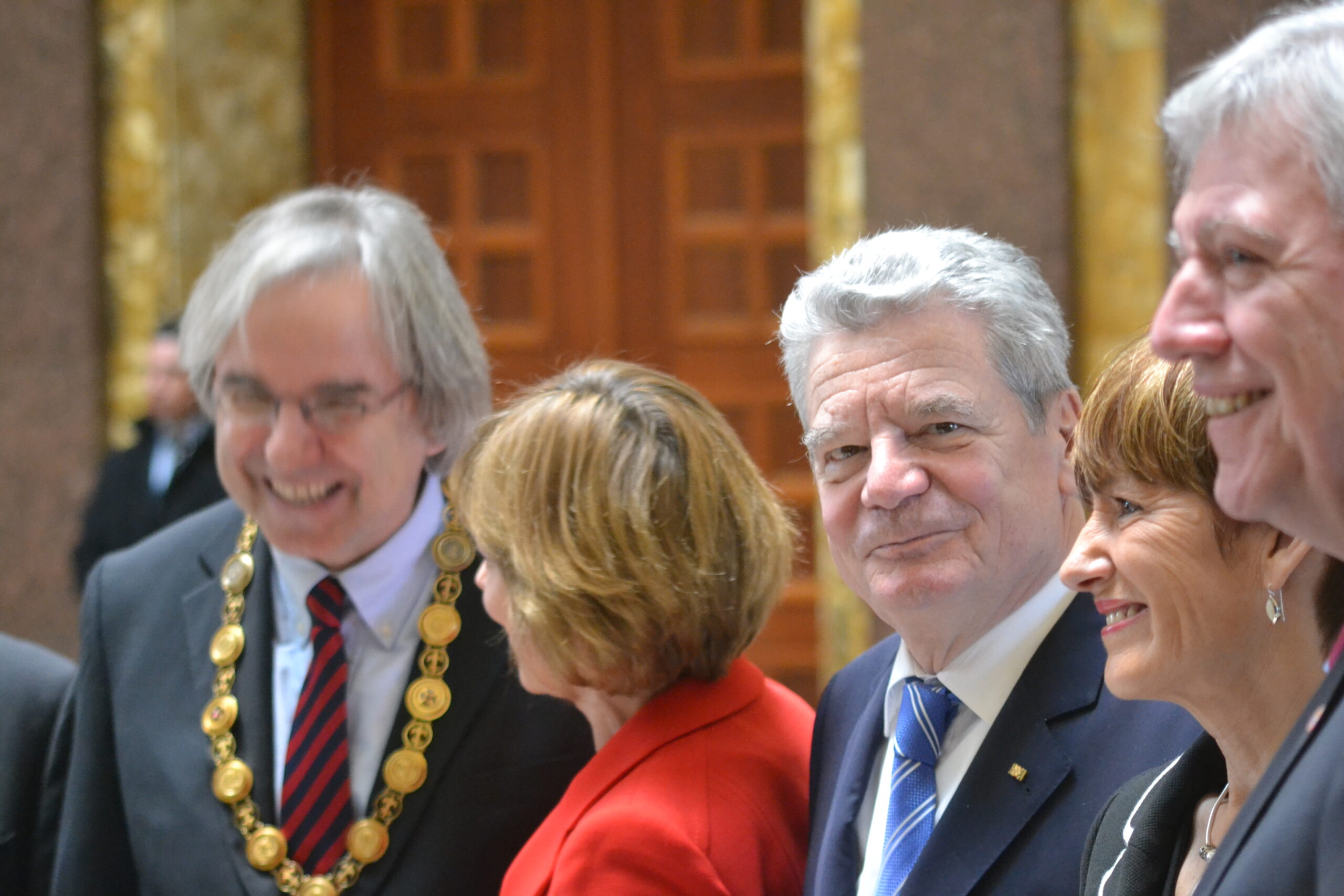 Wiesbaden war der erste Stopp. Bundespräsident Joachim Gauck kam am Freitag zu seinem offiziellen Antrittsbesuch nach Hessen. Seine Lebensgefährtin Daniela Schadt, eine gebürtige Hessin, begleitete ihn. Stationen der Stippvisite waren die Staatskanzlei, das Kurhaus mit Eintrag ins Goldene Buch und das Hotel Nassauer Hof. Im Kurhaus waren alle bester Laune, sogar der abgewählte OB Dr. Helmut Müller, der noch bis 1. Juli im Amt ist, konnte (nach dem, was man so hört zu seinem Befinden, vermutlich zum ersten Mal seit letzten Sonntag) mal wieder herzhaft lachen. Der Bundespräsident sorgte für Lacher, als er nach dem Eintrag ins Goldene Buch ans Rednerpult trat und sagte: „Ich weiß gar nicht, ob mein Ablaufplan vorsieht, dass ich jetzt etwas sage. Aber ich habe das Gefühl, ich sollte es tun.“ Sehr angetan zeigte er sich in seiner kurzen Rede von der noblen Geste, dass OB Müller seinen gewählten Nachfolger Sven Gerich ausdrücklich begrüßt hatte (und ihn später auch als erstes dem hohen Gast vorstellte): „Das fand ich sehr schön“, meinte der ehemalige Pastor. „Begrüßt“ wurde der Bundespräsident draußen zwischen Kurhaus und Nassauer Hof auch von Fluglärmgegnern. Deren Anliegen lägen nicht in seinem Zuständigkeitsbereich, zeigte er kein Interesse am Austausch mit den lautstark Protestierenden. Hier geht´s zu unserem Gauck in Wiesbaden-Album. (dif)