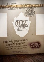 Gekratzt, Geschmiert, Kopiert, Signiert: Erwerbliches aus den schummrigen Hinterhöfen der Landeshauptstadt. Heute veranstaltet die Hessische StaatsGalerie mal wieder „den zweiten StaatsWeihnachtsMarkt seit tausend Jahren“. Und lockt mit dem Versprechen: „Die Wiesbadener DesignFotoKunstIlluElite verkauft Euch Verkäufliches aus den Privatsammlungen“ ins heimelig hergerichtete Hinterhaus in der Oranienstraße 6. Die Hänger aus dem HängerSchutzGebiet und die bunte Vielfalt aus dem QrrrZoo fusionieren, um den Besuchern begehrte Ware fernab vom Üblichem darzubieten. Ab 16 Uhr mit prasselndem Kamin, heißem Glühwein & kaltem Bier (und mit 1x Glühwein umsonst für Ailaikverkaterte, nur mit Eintrittskarte der gestrigen fantastischen Ailaik-Party im Schlachthof und nur solange Vorrat reicht.)