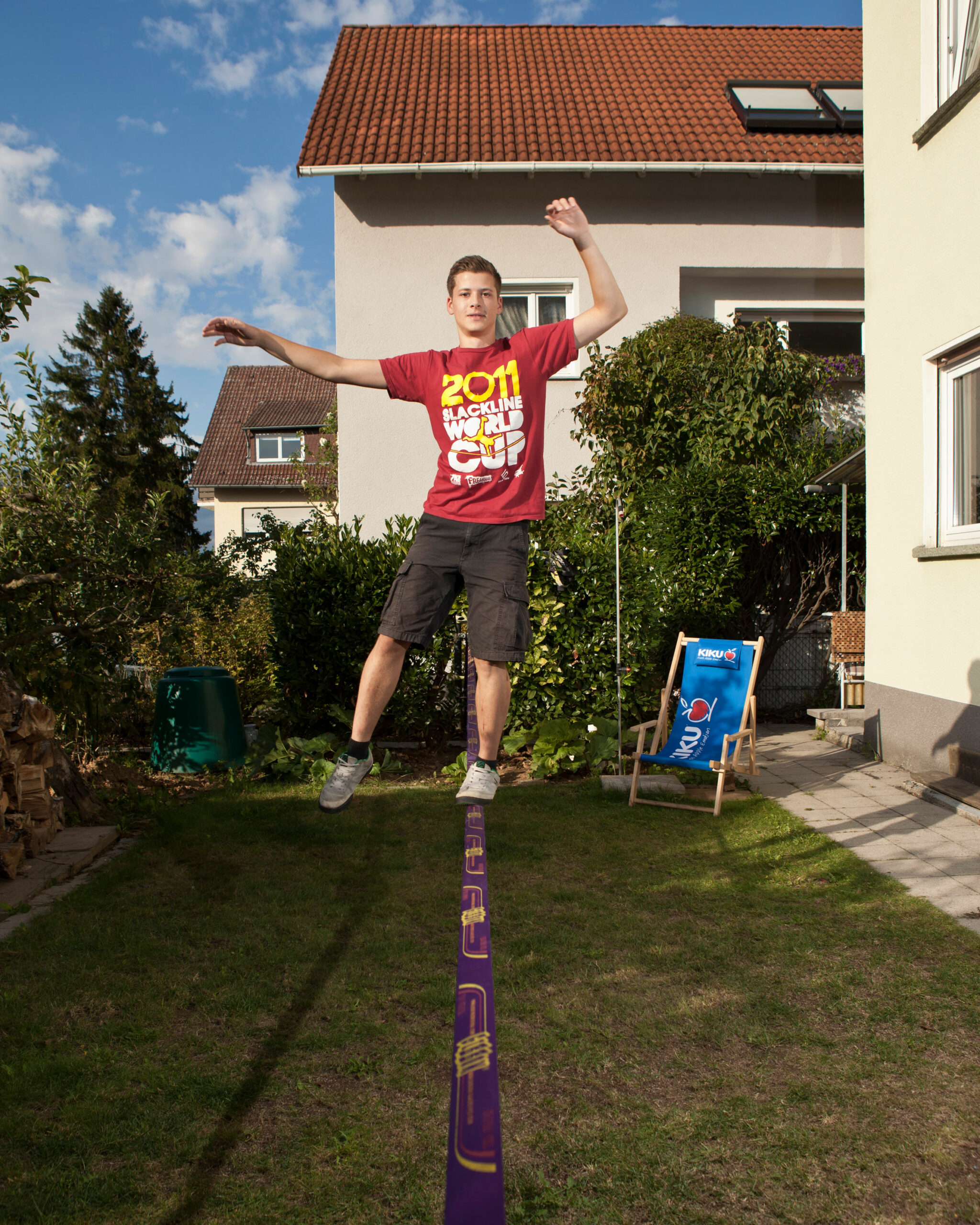 Auch die Slackliner sind Outdoor-Sportler und haben bald ihr Saisonende erreicht. Der 17-jährige Maurice Wiese ohnehin, denn bei seinem ersten Wettkampf in den USA hat er sich das Kreuzband überdehnt. Zwar hat er trotzdem noch den vierten Platz belegt, muss aber nun einen Monat pausieren. Bezahlt hat die Reise sein Sponsor, denn „Momo“ ist so talentiert, dass er ein halbes Jahr, nachdem er seine erste Slackline gekauft hat, bereits einen Finanzier gefunden hat. Das war Anfang 2009. Ein Jahr später gewinnt der Hofheimer den ersten WM-Titel in seiner Sportart überhaupt. Der vierte der Weltrangliste trainiert ausschließlich im heimischen Garten, in den drei Metallstangen einbetoniert werden mussten. Denn die Slackline kann beim Ausüben der Tricks eine Zugkraft von sechs Tonnen entwickeln. „Der Sport ist so neu, dass man sich immer wieder was Neues ausdenken kann“, erläutert Momo, was ihn so daran fasziniert. Seit er damit angefangen hat, fährt er nicht mal mehr sein Skateboard, auf dem er die Grundlagen für die heutigen Tricks gelegt hat. Dabei musste Mutter Andrea ihn mit elf Jahren immer zur Skate-Halle fahren. Nach Wiesbaden übrigens, womit vielleicht der letzte noch fehlende Beleg dafür erbracht ist, dass die Kurstadt durchaus ein guter Nährboden für erfolgreiche Sportler sein kann.