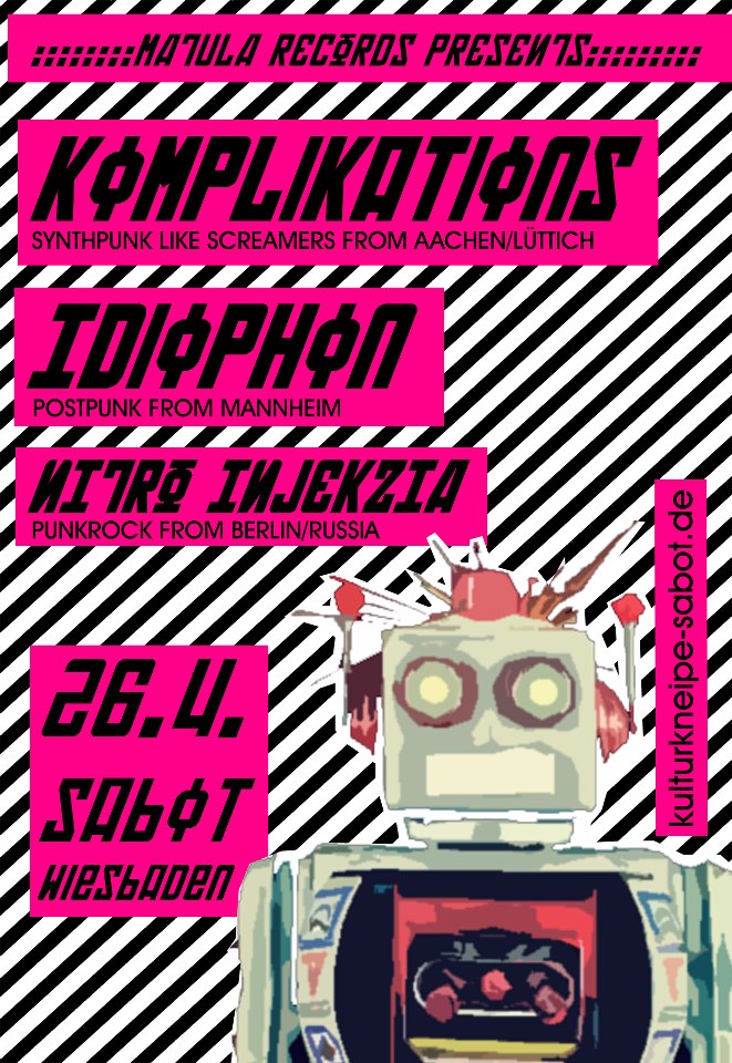 Dreifach Punk steht heute der Kulturkneipe Sabot in der Zimmermannstraße ins Haus. Komplikations, Idiophon und Nitro Injekzia spielen auf, anschließend wird noch tolle Musik vom Plattenteller versprochen. Präsentiert wird das Ganze vom Wiesbadener Label Matula Records, da kann eigentlich gar nichts schiefgehen. Die Bands im Einzelnen …