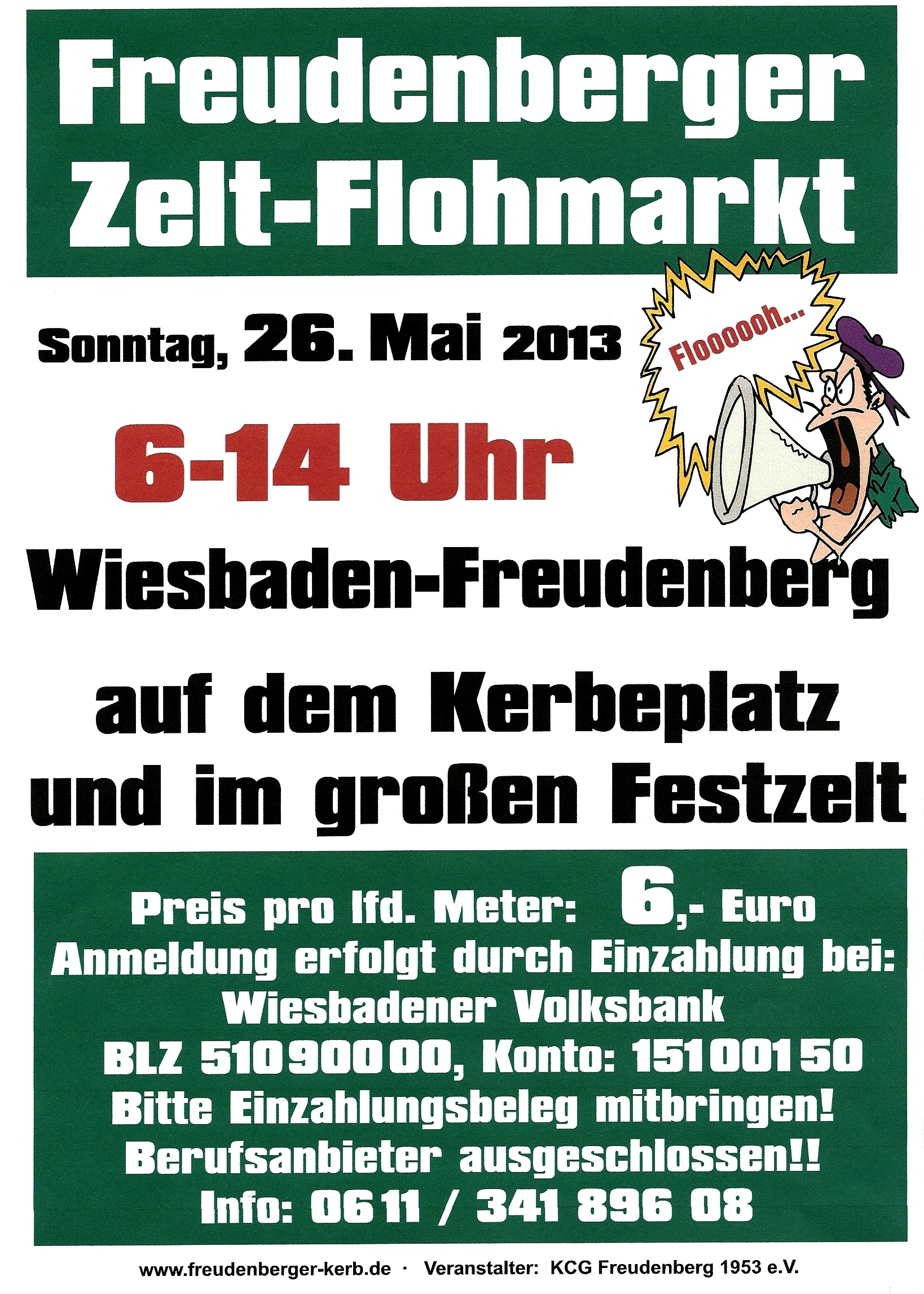 Am Sonntag, dem 26. Mai, von 6 bis 14 Uhr findet der alljährliche Freudenberger Zelt-Flohmarkt statt. „Der Geheimtipp unter den Wiesbadener Flohmärkten“ findet nur einmal im Jahr, am Wochenende vor der Freudenberger Kerb, statt und ist vollkommen wetterunabhängig. Anmeldung erfolgt durch Einzahlung bei: BLZ 510 900 00, Konto: 15100150. Bitte Einzahlungsbeleg mitbringen. Berufsanbieter sind ausgeschlossen. Info: 0611/34189608. www.freudenberger-kerb.de