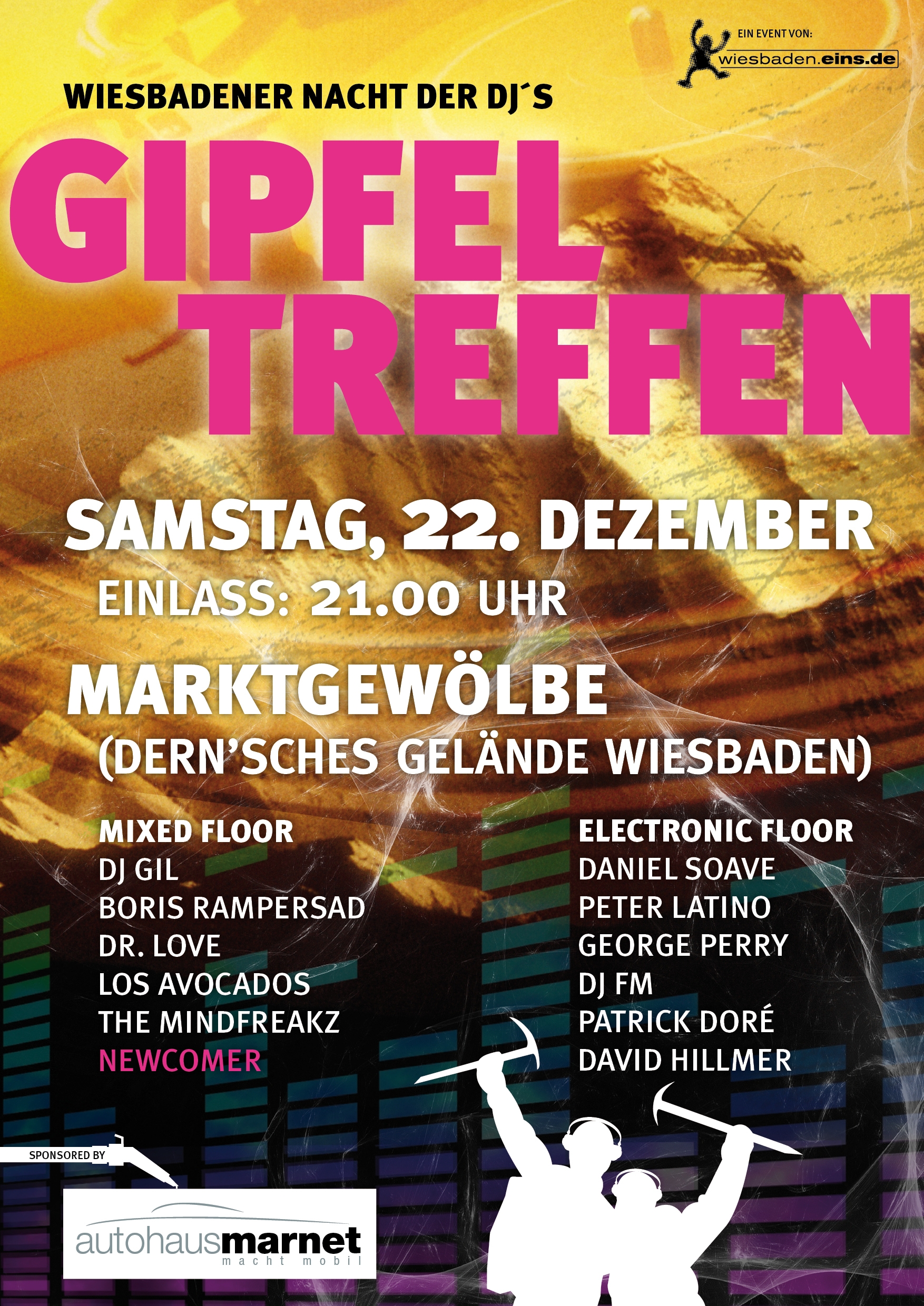 Das Beste zum Schluss! Am Samstag, dem 22.12., wird mit dem „GIPFELTREFFEN“ das „außergewöhnlichste Dj-Event Wiesbadens“ angekündigt. wiesbaden.eins.de lädt ins Marktgewölbe, in dem nach dem fulminanten Abstieg in die Partykatakomben alle bekannten Größen der regionalen Dj-Seilschaft auf gleich zwei Floors zum gemeinsamen Stelldichein zusammenkommen.
