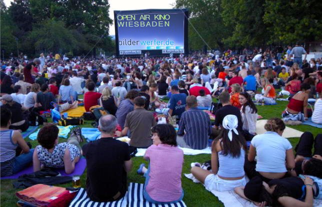 Diese Nachricht wird Open Air-Kinofans freuen: Auch im Sommer 2013 findet das Bilderwerfer Open Air Kino auf den Reisinger Anlagen Wiesbaden statt. Auf der Veranstaltungsseite www.bilderwerfer.de wurden jetzt die Durchführung der Reihe bestätigt und die Termine bekanntgegeben: „Vom 27. Juni bis 20. Juli wird es jeweils donnerstags bis samstags Abends Filme zu sehen geben.“ Zum 16. Mal wird es Freiluft-Filmvergnügen in einzigartiger Atmosphäre auf der Wiese gegenüber vom Hauptbahnhof geben. Im vergangenen Jahr war der langjährige Organisator der Kinonächte, Ronald Meynen, verstorben. Das genaue Programm wollen die Macher, die seine Arbeit fortführen, in den nächsten Wochen zusammenstellen und bekanntgeben. Das Open Air Kino in der Reduit wird hingegen nicht mehr stattfinden. – Foto (c) Bilderwerfer –