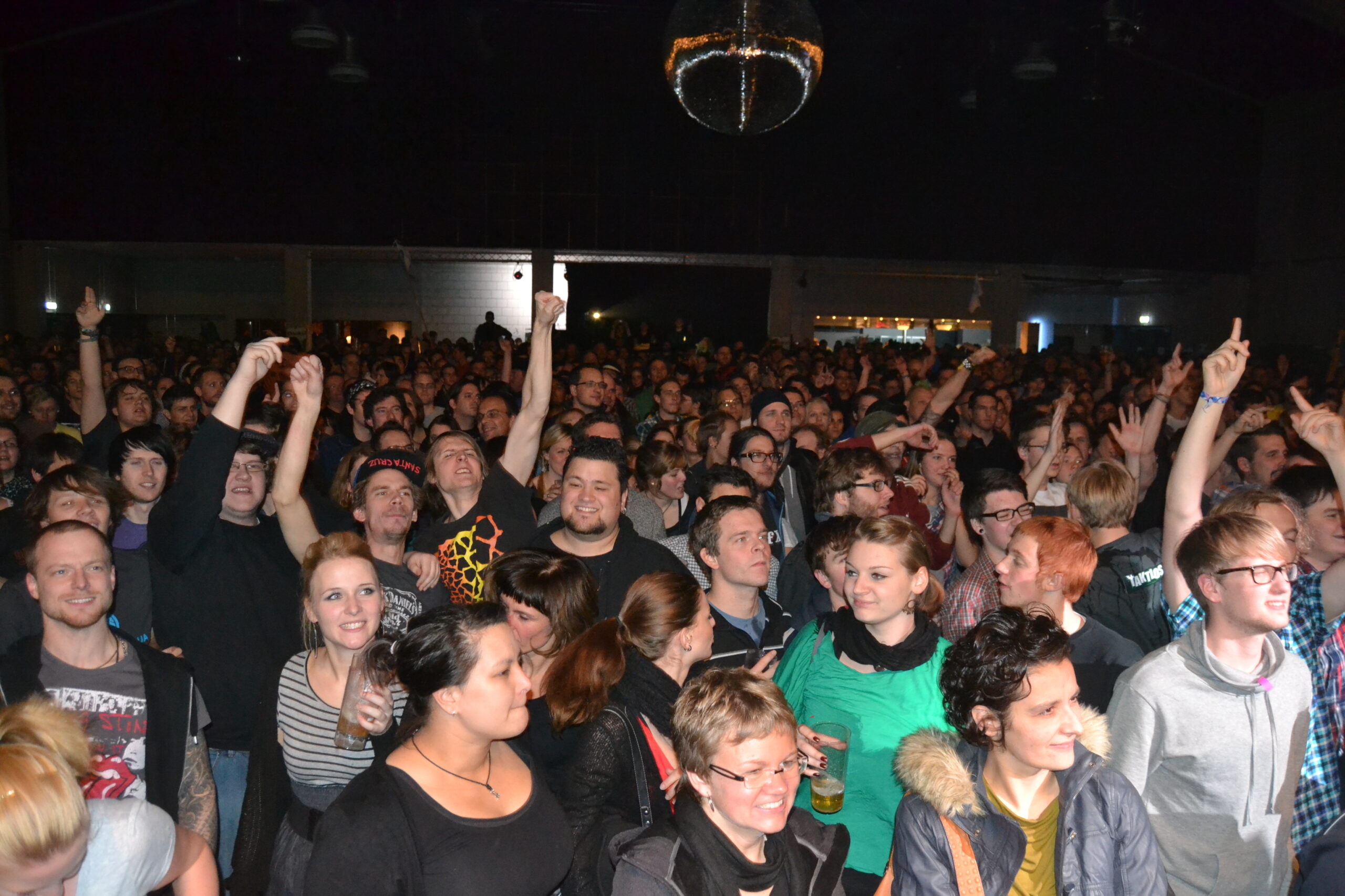 Wären nicht überall diese besonders glücklich erscheinenden und ziemlich aufgeregten Gesichter gewesen, hätten sich nicht ständig und überall irgendwelche Leute strahlend in den Armen gelegen, man wäre kaum auf die Idee gekommen, dem allerersten Konzert, der allerersten Party in dieser Halle beizuwohnen. Glücklich und aufgeregt erschien auch die Band, die als allererste auf der neuen Bühne stehen durfte – die für diesen Anlass reaktivierten Ska-Punk-Soul-Helden von Frau Doktor, die mit Konfettikanonen vom Schlachthof-Team auf der Bühne begrüßt wurden und anschließend ein grandioses Konzert hinlegten. Ein weiterer Star des Abends war die megagroße Diskokugel, die aber – so verriet uns Booker Carsten – nur eine Leihgabe ist und im Dezember wieder abgehängt wird. Aber keine Bange, auch die künftigen Hängeobjekte dürften für beeindruckte Blicke und reichlich Gesprächsstoff sorgen.